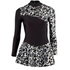Long sleeve leotard in Nylon Lycra with Printed Foil design and attached skirt. Features a polo neck, keyhole back and integrated pants. Suitable for dance, ice skating, cheerleading and majorettes.