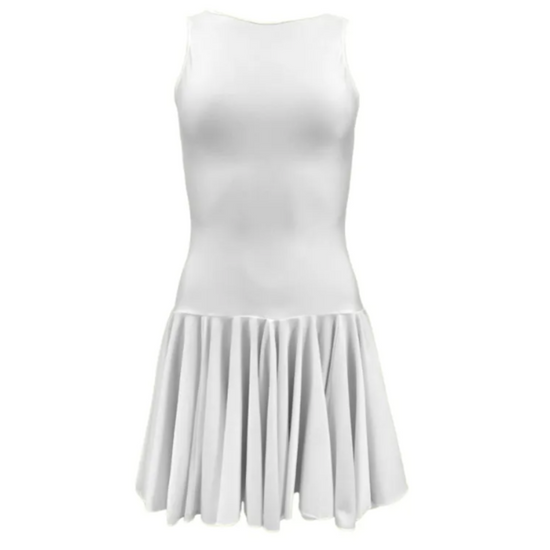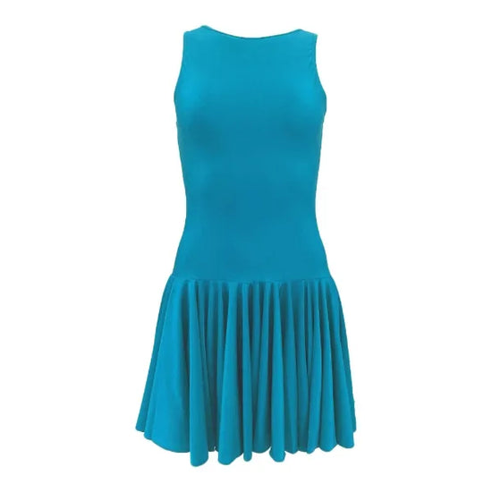 Dance dress with scoop neck, keyhole back and a full swishy skirt from the hip in Nylon Lycra.