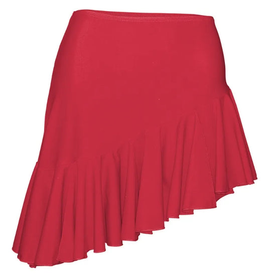 Dance skirt with slanted frill hem and one side seam (to back). Wear it 'Salsa style' slanted from side to side or spin it round, short length to the front, for a 'fishtail effect'.