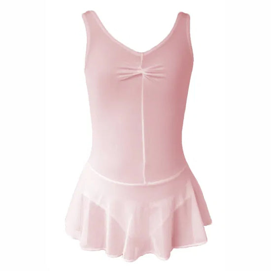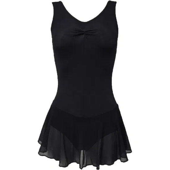 A skirted, sleeveless leotard with a gathered front and stretch-net skirt