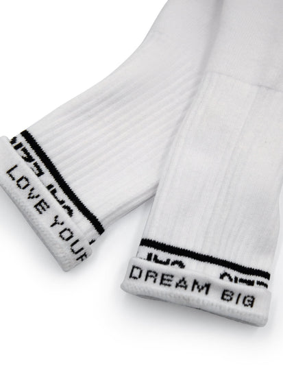 Inside of the socks says "LOVE YOURSELF" and "DREAM BIG"